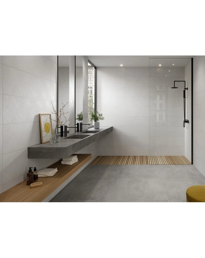 La colección se presenta en formato 30x90 cm. Está compuesta por seis relieves en color blanco, tres de ellos en acabado mate (pure) y los otros tres en acabado brillo con glitter (glow). Estos relieves realzan el estilo y la claridad de los espacios, proporcionando una luz brillante y personalidad única.