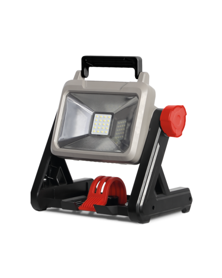 Foco profesional con funcionamiento a batería. La tensión máxima de la batería es de 20 voltios. La luz se puede dirigir gracias a su cabeza giratoria que se inclina hasta 360°. Dispone de tres modos de configuración de luz: flujo luminoso de 2000 lm, de 1000 lm e intermitente